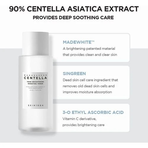 The SKIN1004 Madagascar Centella Tone Brightening Boosting Toner is a hydrating and radiance-enhancing toner formulated with 74% Centella Asiatica Extract from Madagascar — known for its soothing, healing, and barrier-strengthening benefits.