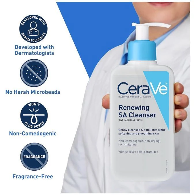 Gently exfoliate, cleanse, and renew your skin with CeraVe Renewing SA Cleanser, formulated with salicylic acid (SA) to smooth rough and bumpy skin while effectively removing dirt, oil, and impurities. Designed for normal to oily, rough, or uneven skin, this dermatologist-developed cleanser helps maintain a healthy, soft, and smooth complexion.