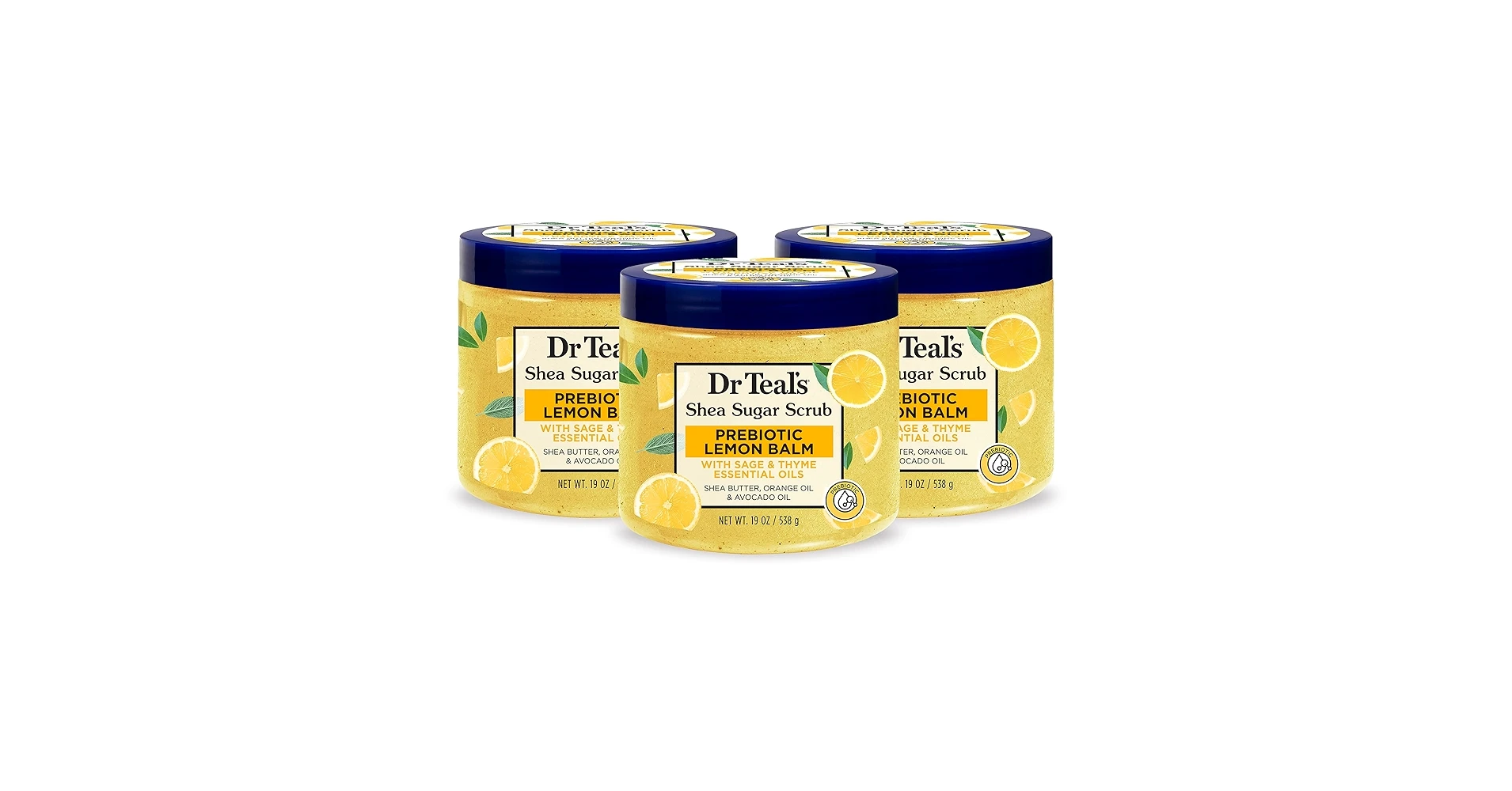 Dr Teal’s Shea Sugar Scrub with Prebiotic Lemon Balm is a revitalizing exfoliant that smooths, softens, and restores your skin’s natural balance.