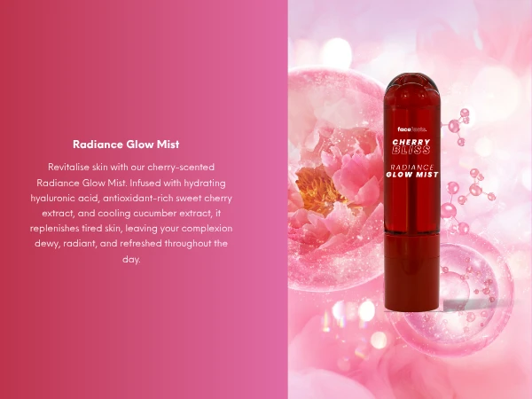 The Face Facts Cherry Bliss Radiance Glow Mist is a refreshing, illuminating facial mist designed to instantly hydrate, revive, and brighten dull or tired skin. Enriched with Cherry Extract, Hyaluronic Acid, and Vitamin C, this mist delivers a burst of antioxidants and moisture to restore your skin’s natural glow and vitality.