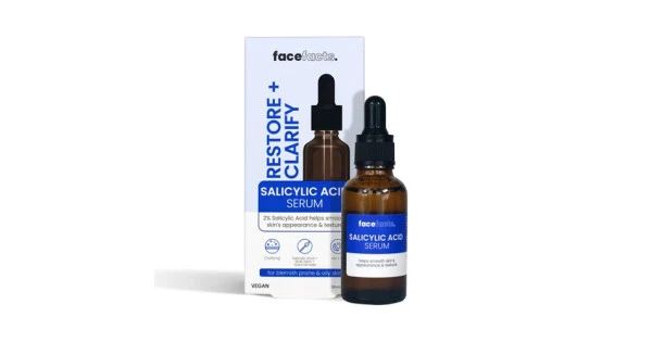 The Face Facts Restore & Clarify Salicylic Acid Serum is a targeted blemish-fighting treatment designed to reduce breakouts, unclog pores, and improve skin texture.