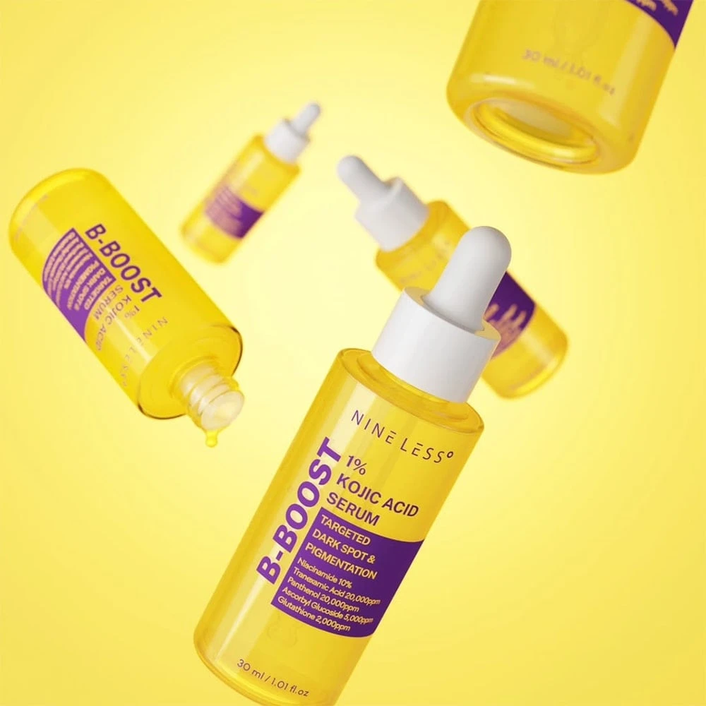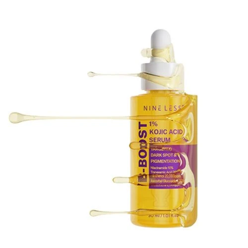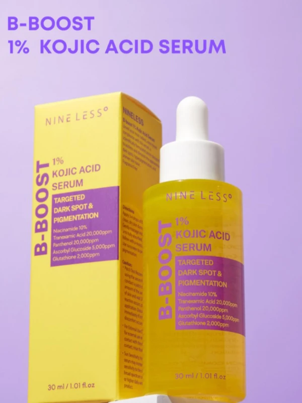 The Nine Less B-Boost 1% Kojic Acid Serum is a brightening and tone-correcting treatment designed to help fade hyperpigmentation, dark spots, and uneven skin tone for a visibly radiant complexion.