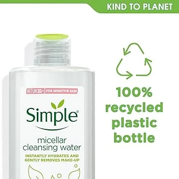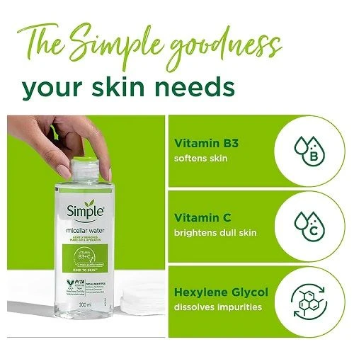 Gently remove makeup, dirt, and impurities while keeping your skin calm and refreshed with Simple Micellar Cleansing Water. Perfect for all skin types, including sensitive skin, this no-rinse formula cleanses effectively without irritation, leaving your skin soft, hydrated, and naturally balanced.